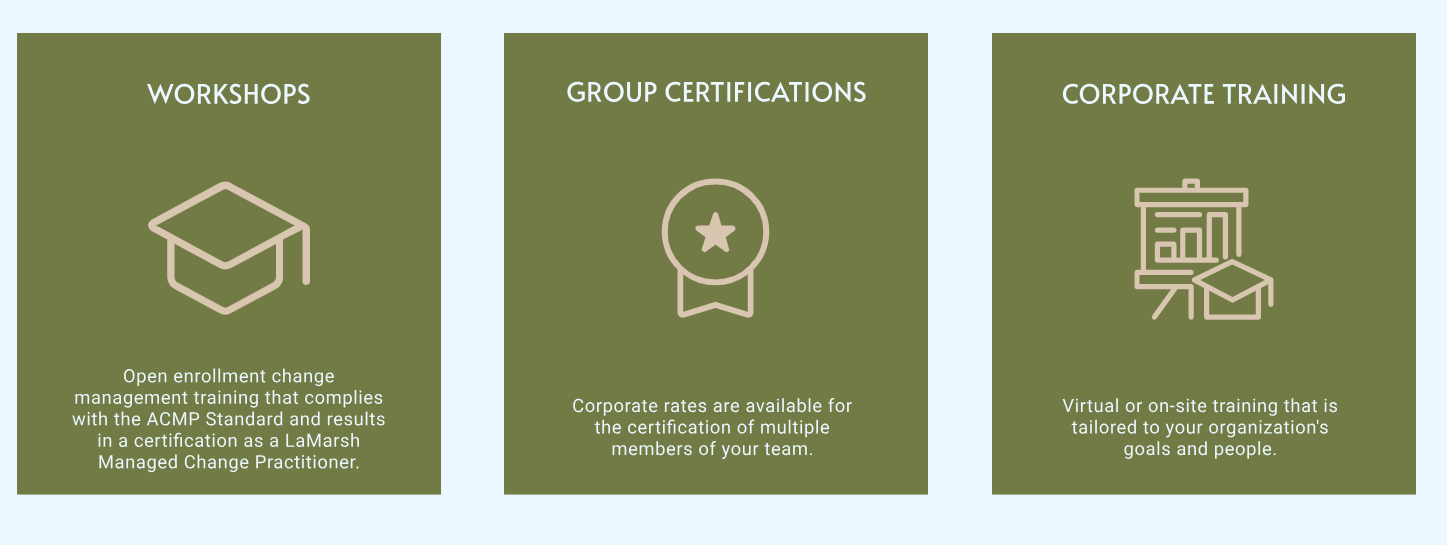 LaMarsh is proud to be aligned with the Association of Change Management Professionals (ACMP) and certified as a Qualified Education Provider. With decades of experience, we help organizations build the capabilities needed to become self-sufficient in managing change. Our customized learning programs are tailored to your organization’s unique needs, advancing the skills of your change practitioners and supporting long-term success.